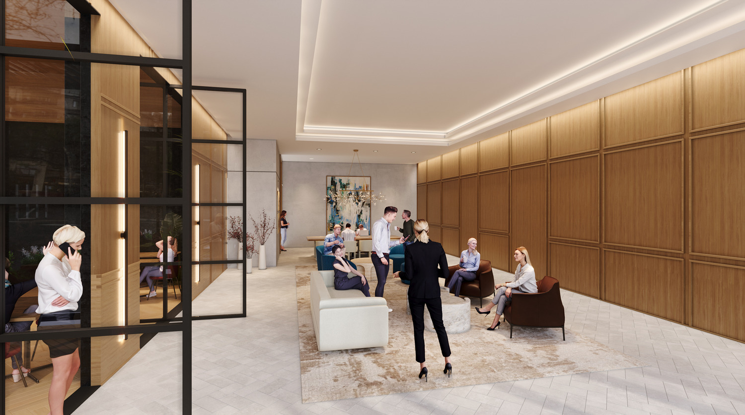 The building will buffer the adjacent residential/office mixed zoning. The design, characterized by pronounced brick detailing and a jewel glass form, contributes to and complements the urban fabric unique to this transition between high-end single-family and commercial corridor. Notable features include an active roof deck restaurant with stunning views, a unique indoor/outdoor level one restaurant/bar, and an interior lobby open to the bar area.