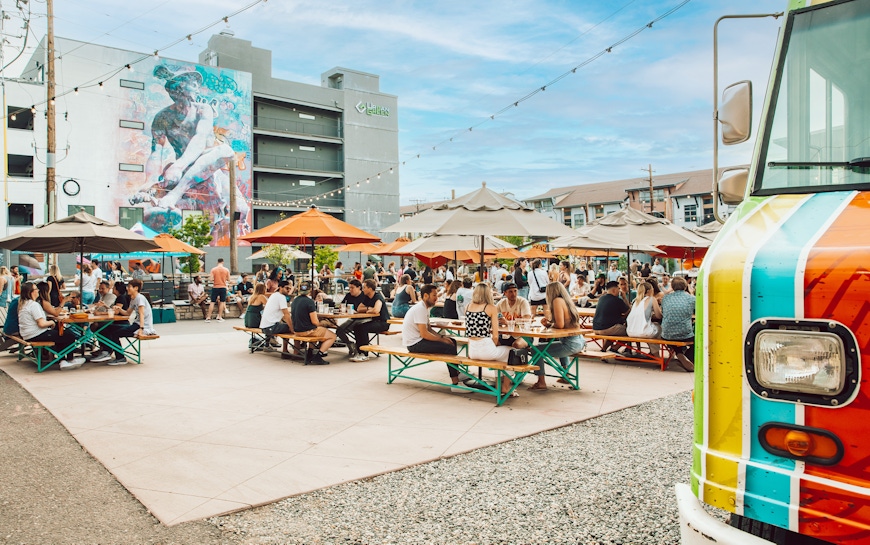 Outside, guests will find an expansive dog-friendly patio that frequently showcases live music, and an art-splashed alleyway that welcomes food trucks, along with a spacious green area ideal for larger social gatherings. Featuring exterior works from internationally recognized artists — including Marissa Napoletano, Casey Kawaguchi and Max Coleman — Improper City has quickly become a community landmark.