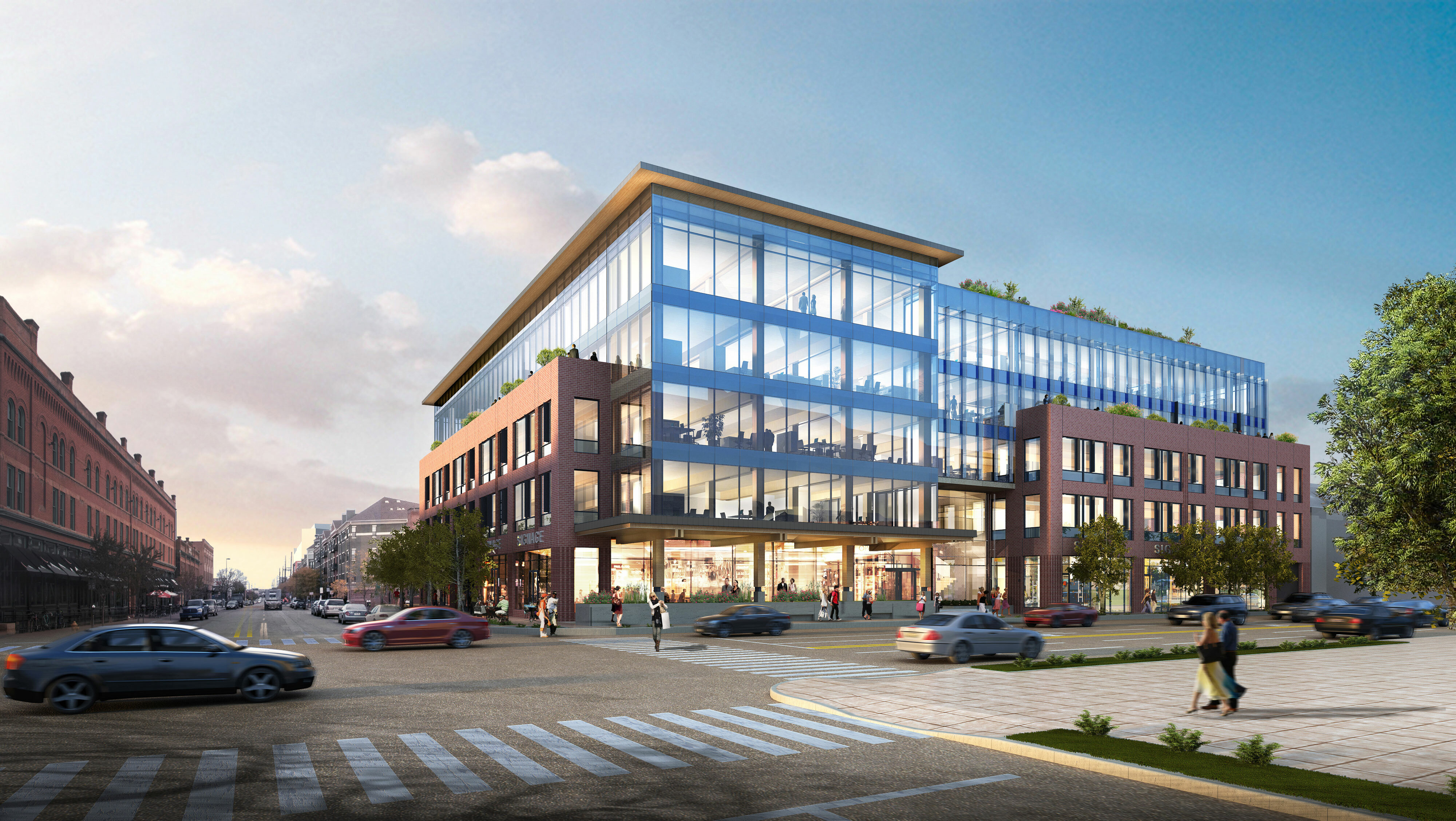 Our team used a diverse arrangement of materials for the building’s exterior, carefully selecting each to keep the overall effect visually interesting without becoming noisy. Serving as transitional pieces, brick in varying but familiar tones wraps the corners of the building while a classically detailed red brick mass sits mid-block along Broadway, to anchor the Broadway frontage. These different textures and shallow differences in massing provide richness and lend to the sense that this building is at home among the historic shopfronts that line Broadway. On the western face, the building steps down to serve as a transition to the scale of the historic Baker neighborhood.