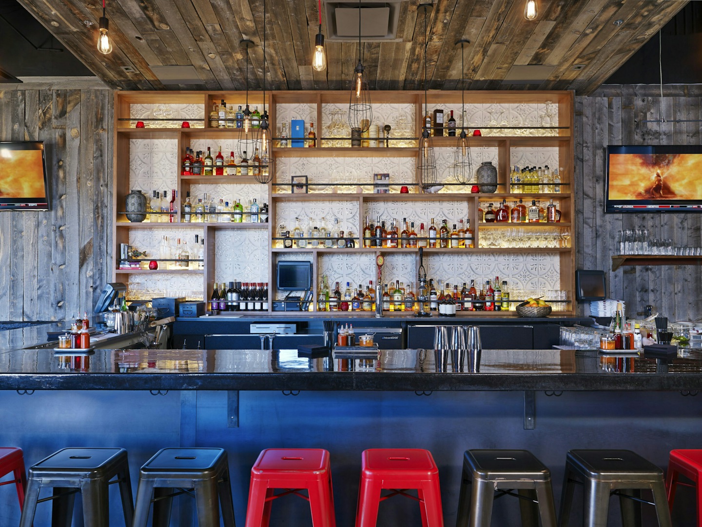 A southeast Asian street food concept located in Snowmass Base Village, Bia Hoi features a rustic industrial interior. Reclaimed wood, comfortable seating, and signature light fixtures provide the base accents for this energized space, with pops of bright color that warm up the winter chill outside. The open plan, casual seating and a bar-centric menu deliver a popular après ski experience.