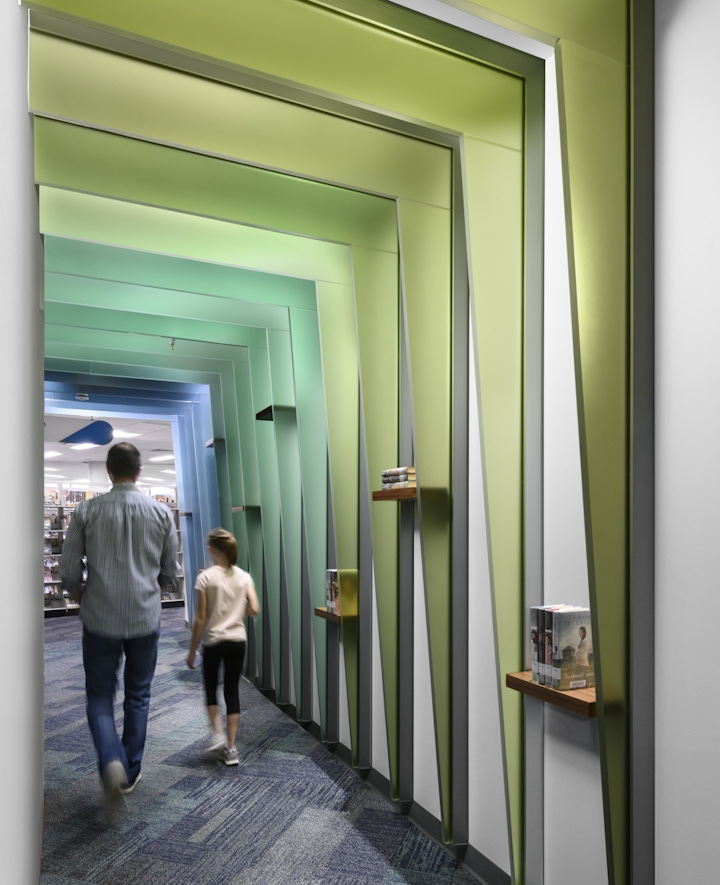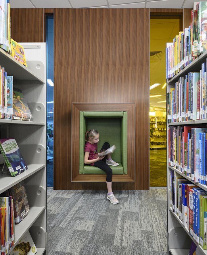 The Castlewood Library in Centennial was renovated to substantially brighten the space and energize under-used nooks throughout the large, single-story building. While retaining the same shape, new pathways and efficiencies within the staff spaces lend themselves to new uses and viewpoints for patrons. The space creates a more open, day-lit entrance, while a new meeting room and study areas offer a variety of uses for groups. The children’s area offers specialized feature walls and fun design elements to harness the power of play and create a whimsical interest. Elements such as a child-sized door encourage discovery and help children explore color, form, scale, and texture.