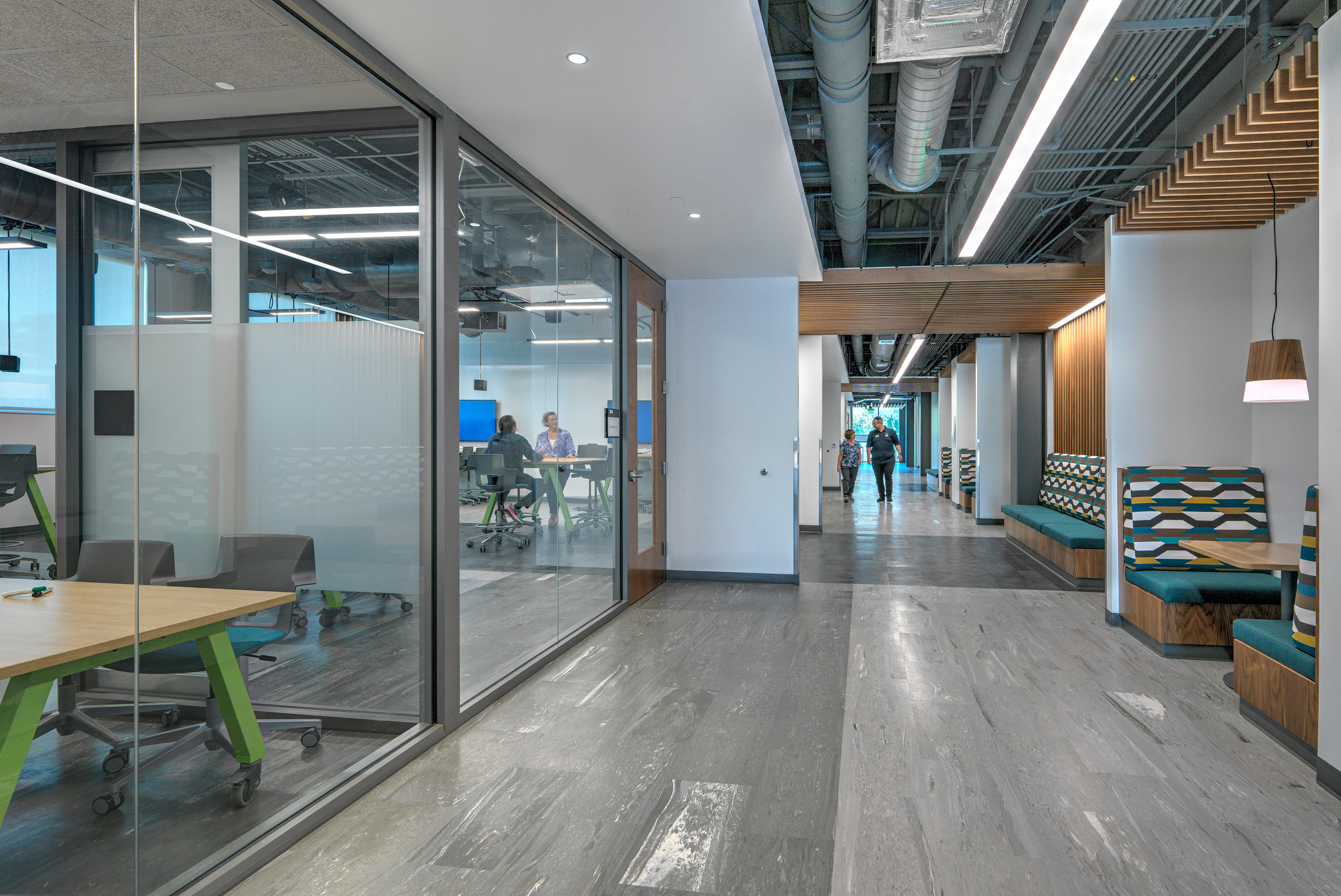 The facility includes numerous sustainable design elements to reduce its environmental footprint. To balance the flow and aesthetic of the building with sustainable design, OZ incorporated rain gardens and other stormwater features that filter out pollutants and increase filtration across the facility. Low-flow plumbing fixtures were installed to decrease water use by 40%, and the 75kW solar photovoltaic array provides renewable energy to offset 43% of the total building energy cost. LED lighting, a high-performance building envelope, and the VAV system tied to the campus that provides chilled water and steam have all contributed to a reduced energy consumption of 44.1% (over an ASHRAE 90.1 2010 baseline). The parking garages include eight publicly accessible EV charging spaces on the ground floor.