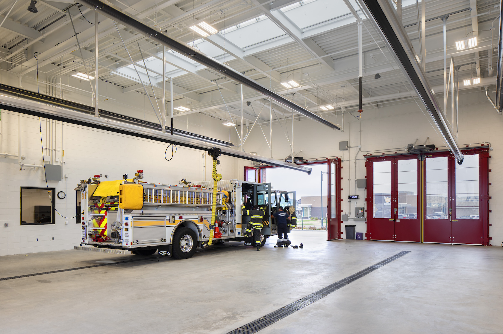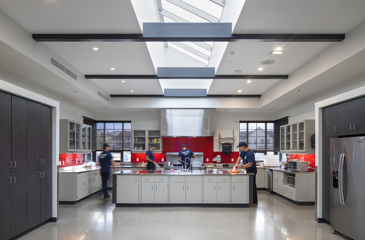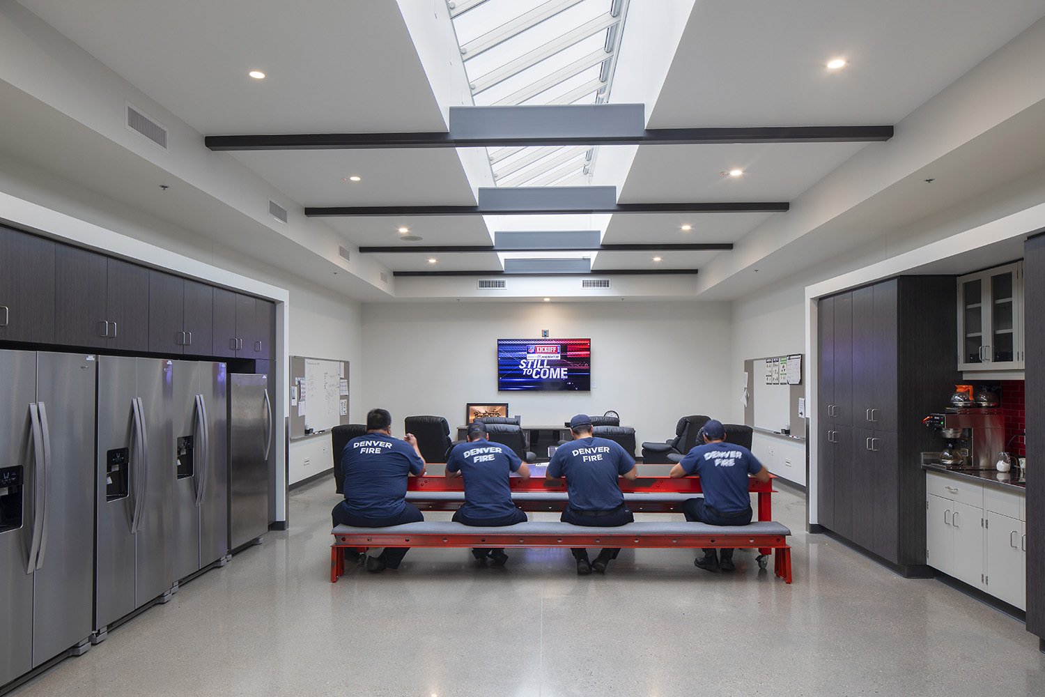 Denver Northfield Fire Station No. 39 was built in response to the growing Northfield community in Central Park, a mixed-use community built on a former airport site. As an integral part of the community, the station serves many functions—as the first responders’ workplace and home, a place for apparatus storage and repair, and a good neighbor within the community structure. The station is LEED Gold certified, and the overall design balances functionality with sustainability for this important public facility. Traditional exterior design and materials were used to continue the strong image of DFD, with careful planning and detailing of the interior for a light-filled living area with access to the apparatus bay at all times. As a public building, operations and maintenance are key to this 50/100-year building, including sustainable design. For overall energy-use reduction, OZ incorporated high-performance glazing and efficient lighting and mechanical systems. Healthy building materials and ample daylight through vertical glazing and skylights, a fitness center, and occupant controls were all implemented to support the comfort and health of the firefighters. Water-conserving toilets, faucets, and showers results in a 46% water use reduction as well.