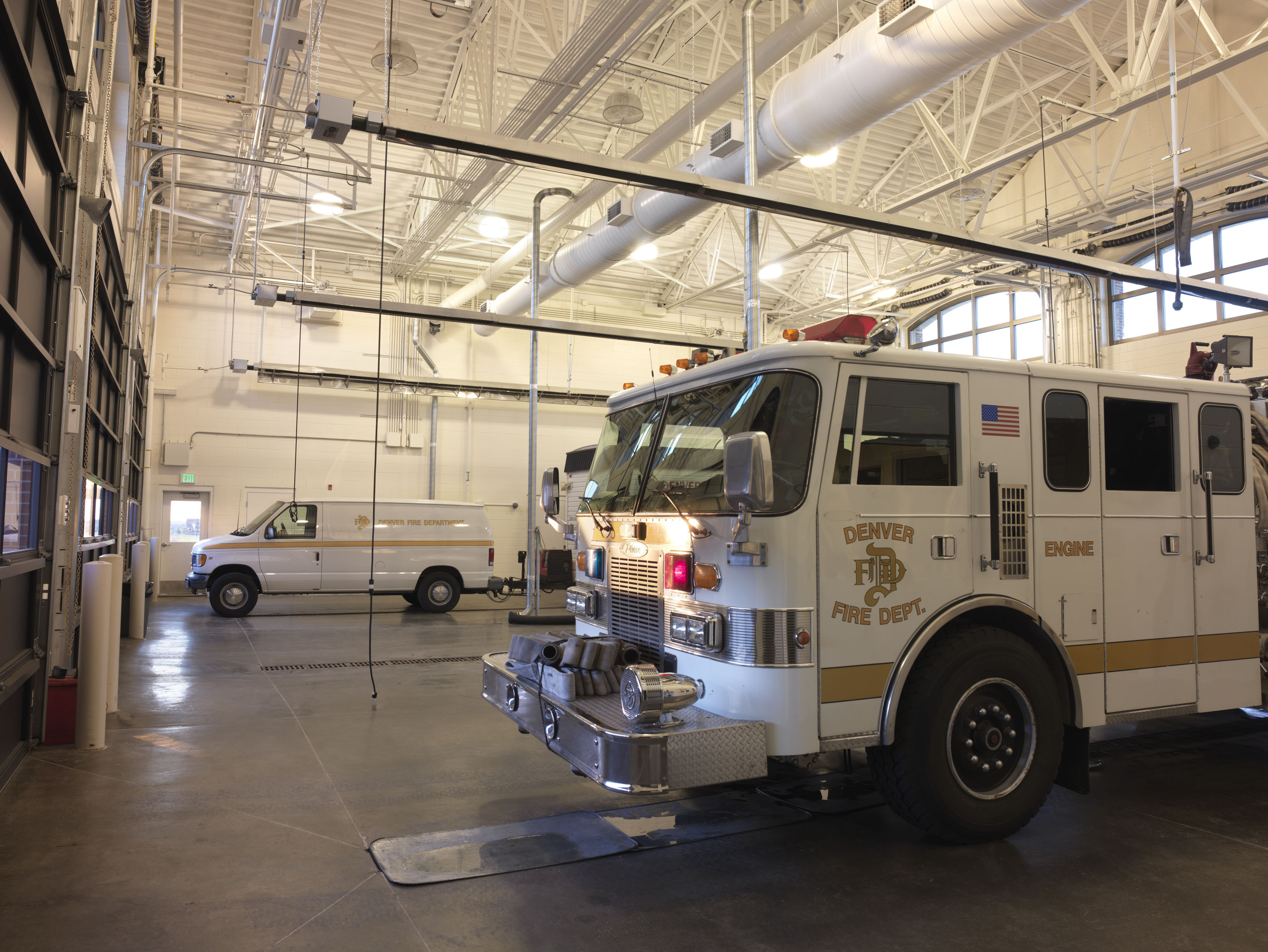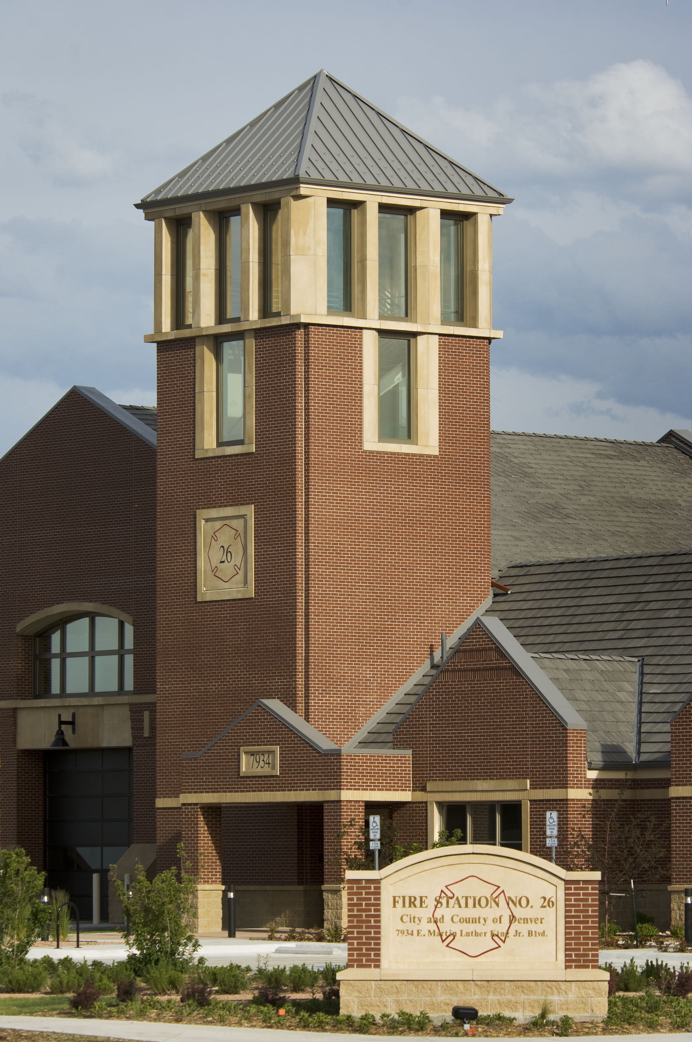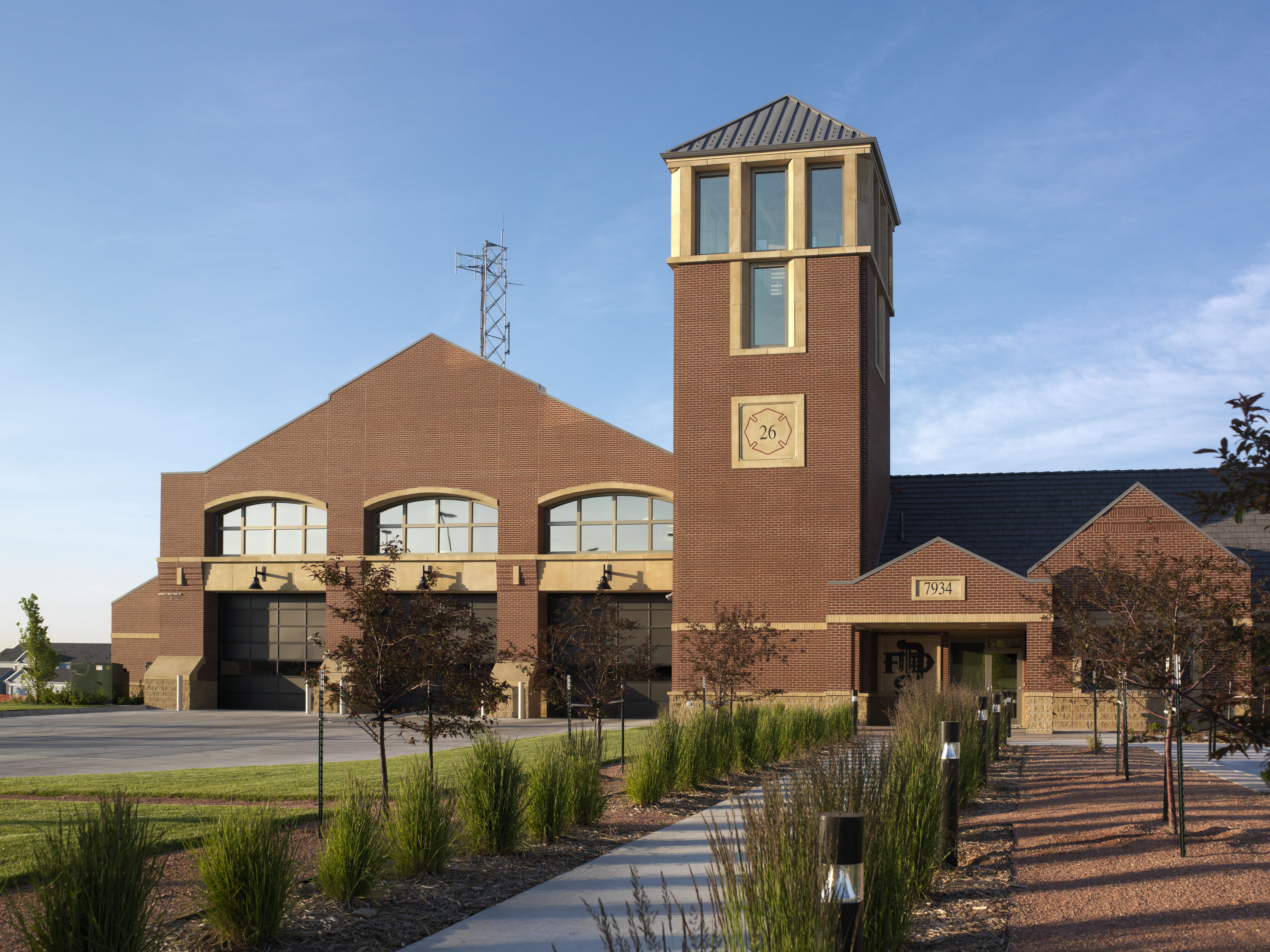 Returning to firehouse design that creates a civic presence and a true neighborhood landmark, this traditionally-styled station boasts state-of-the-art amenities. The new station houses 32 firefighters working in three shifts. The 75-foot tower is functional for hose drying and is used for rappelling exercises and other firefighter training. Unusual for an urban setting, the station’s pull-through design enhances pedestrian safety while decreasing response time. The facility includes three apparatus bays, a separate public zone with a meeting room that neighbors can reserve, and a private zone surrounding an interior courtyard for natural daylight and privacy for the firefighters.
