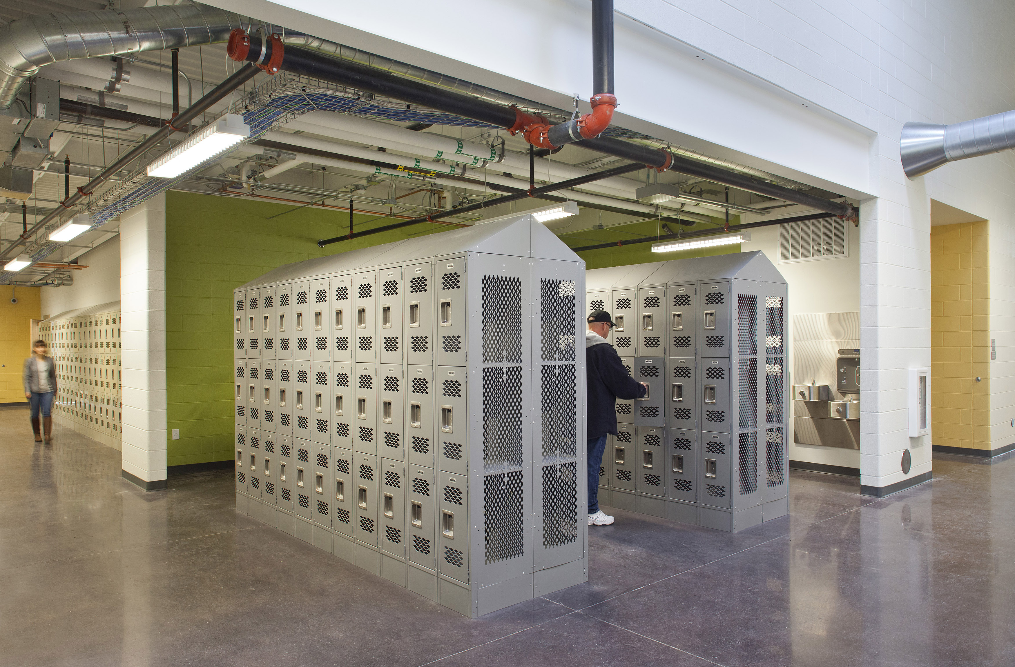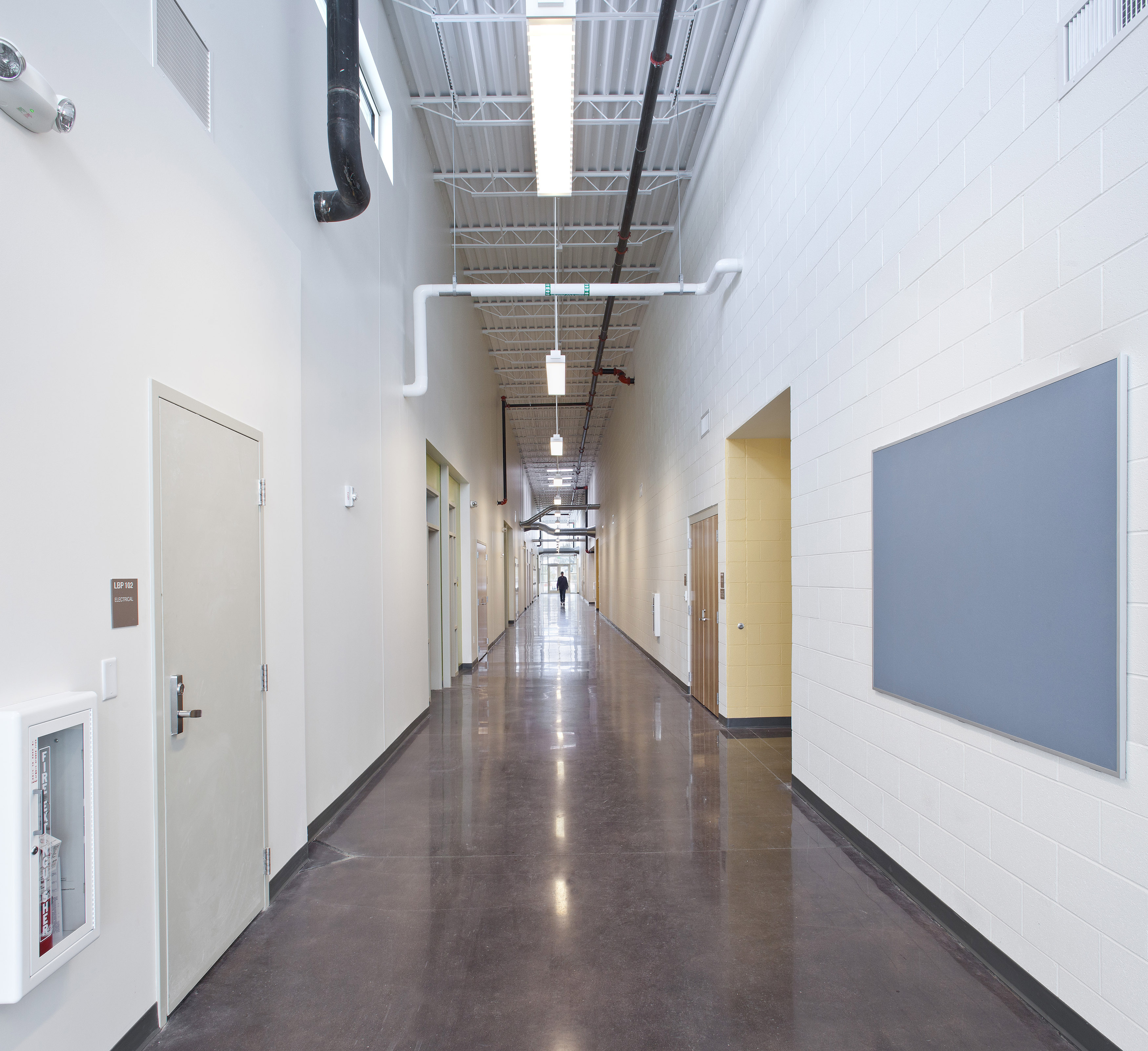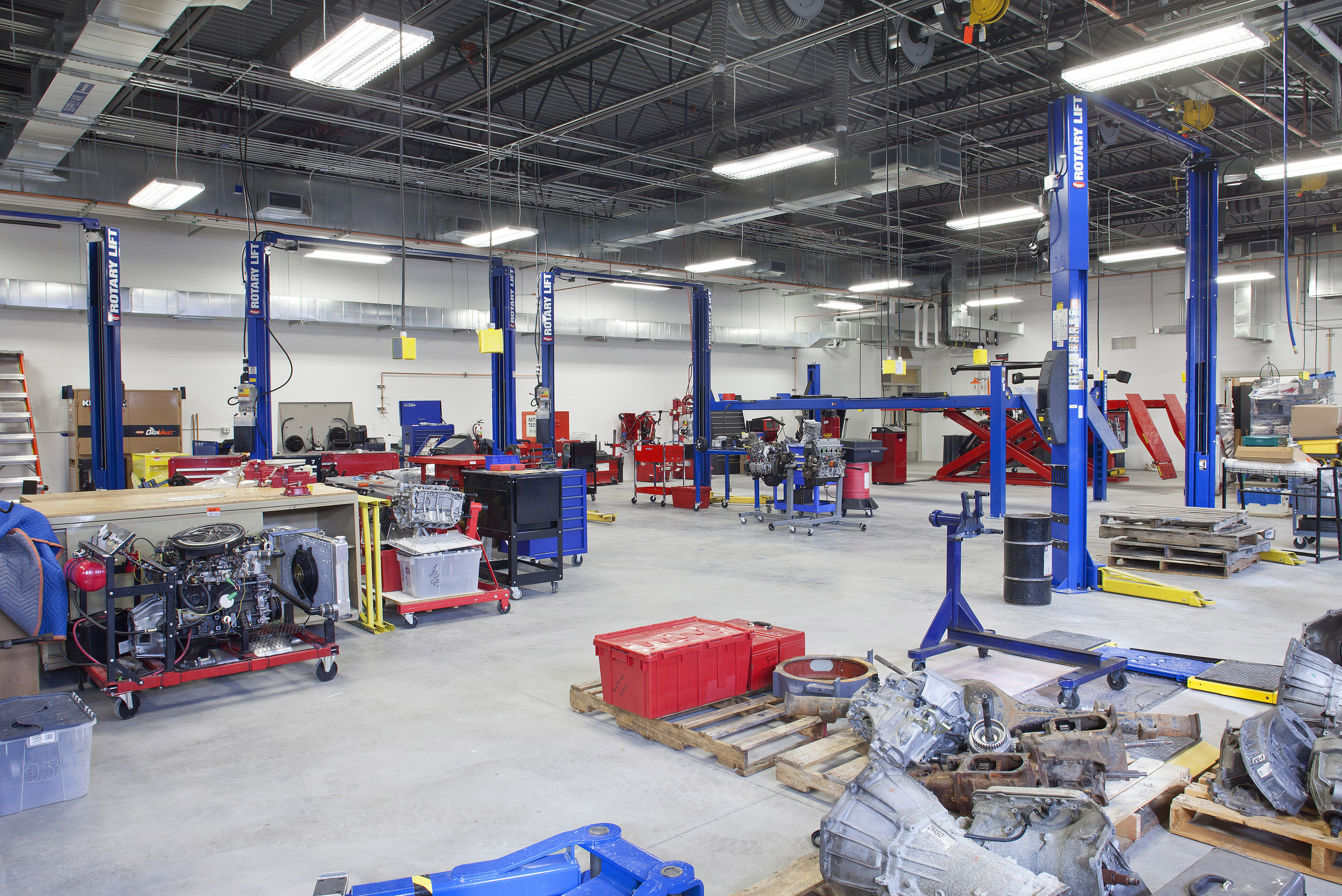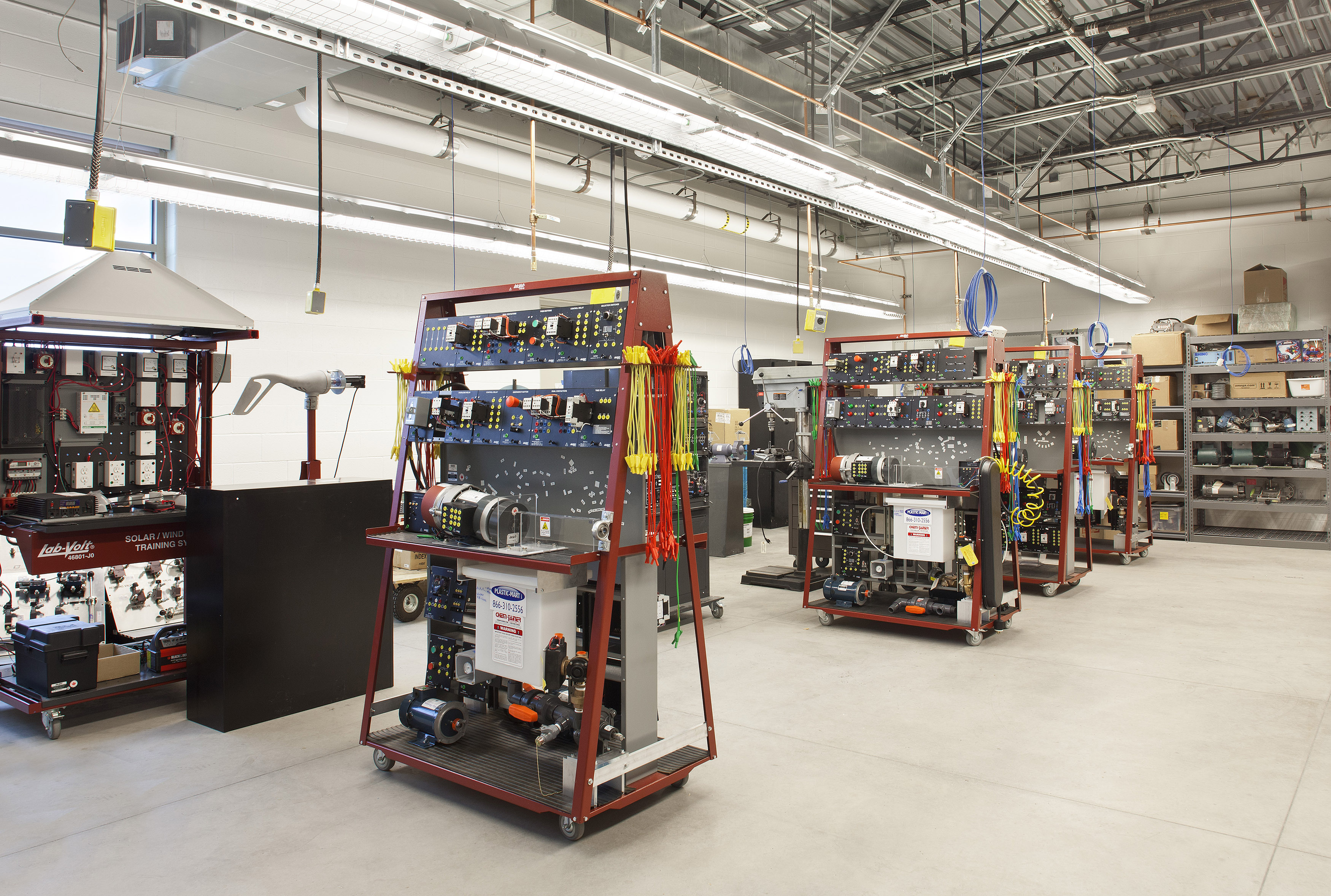 The Little Bear Peak building was designed to house lab space for fabrication and testing, and was the first in a series of buildings that OZ master planned and designed for the Larimer campus The electronics lab provides space for students to learn about clean energy technology, such as photovoltaics, and jthe fabrication lab supports welding and other metal fabrication processes. An engines lab was included in the automotive shop for the disassembly, modification and testing of engine components.