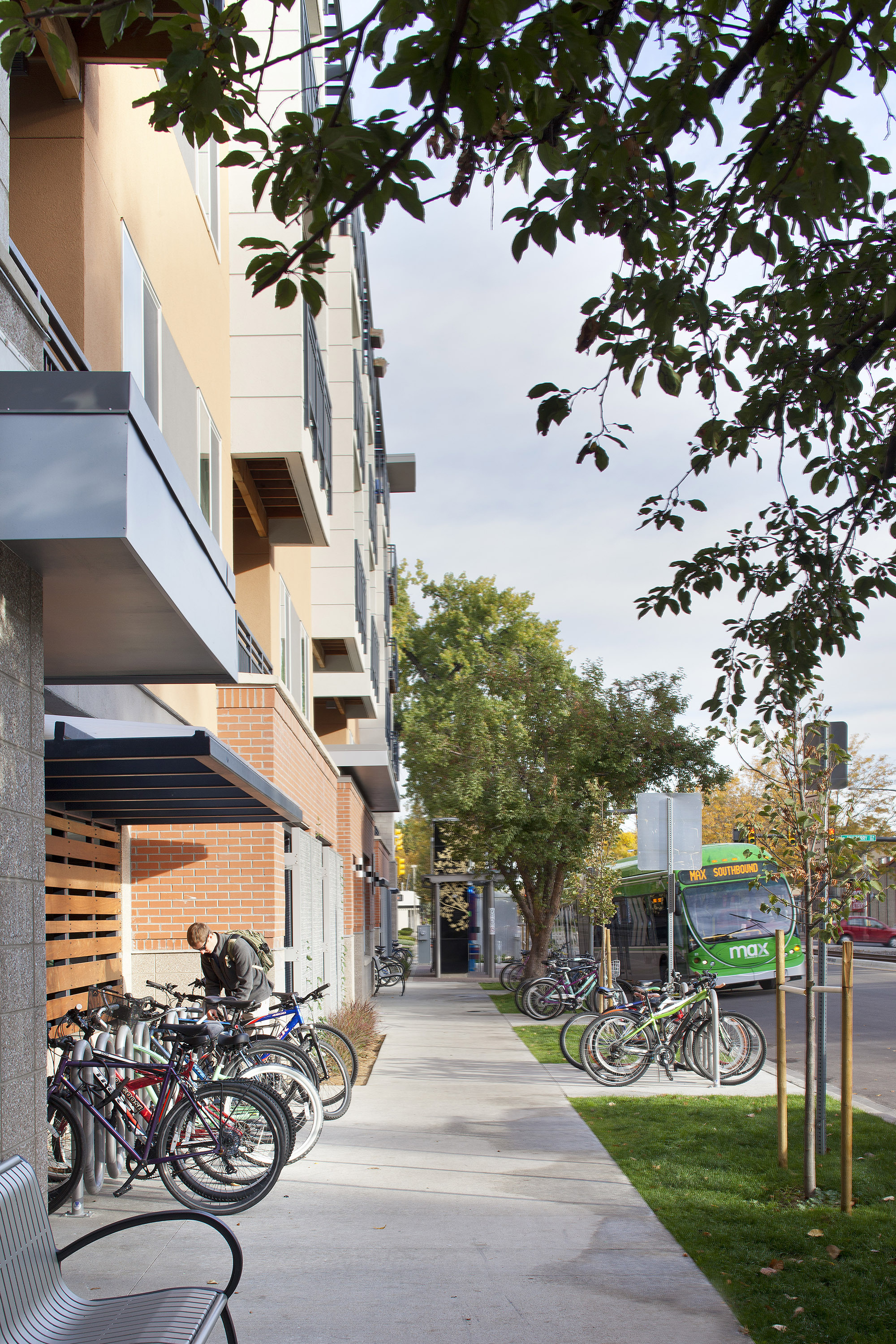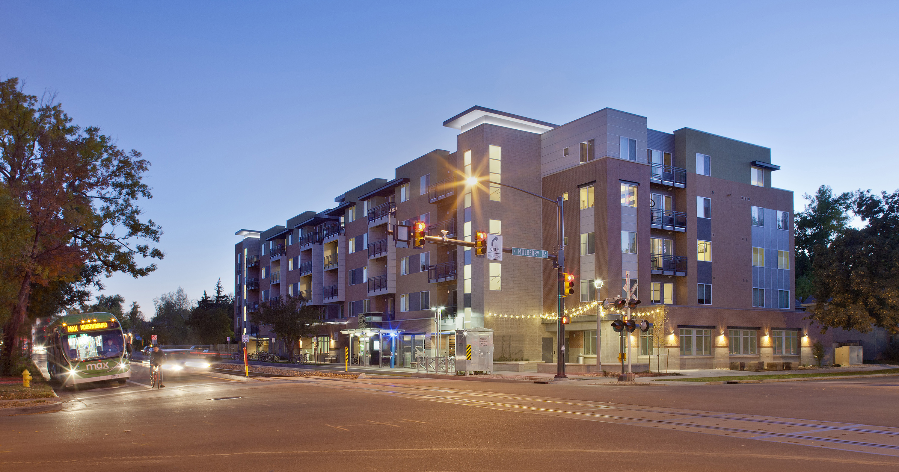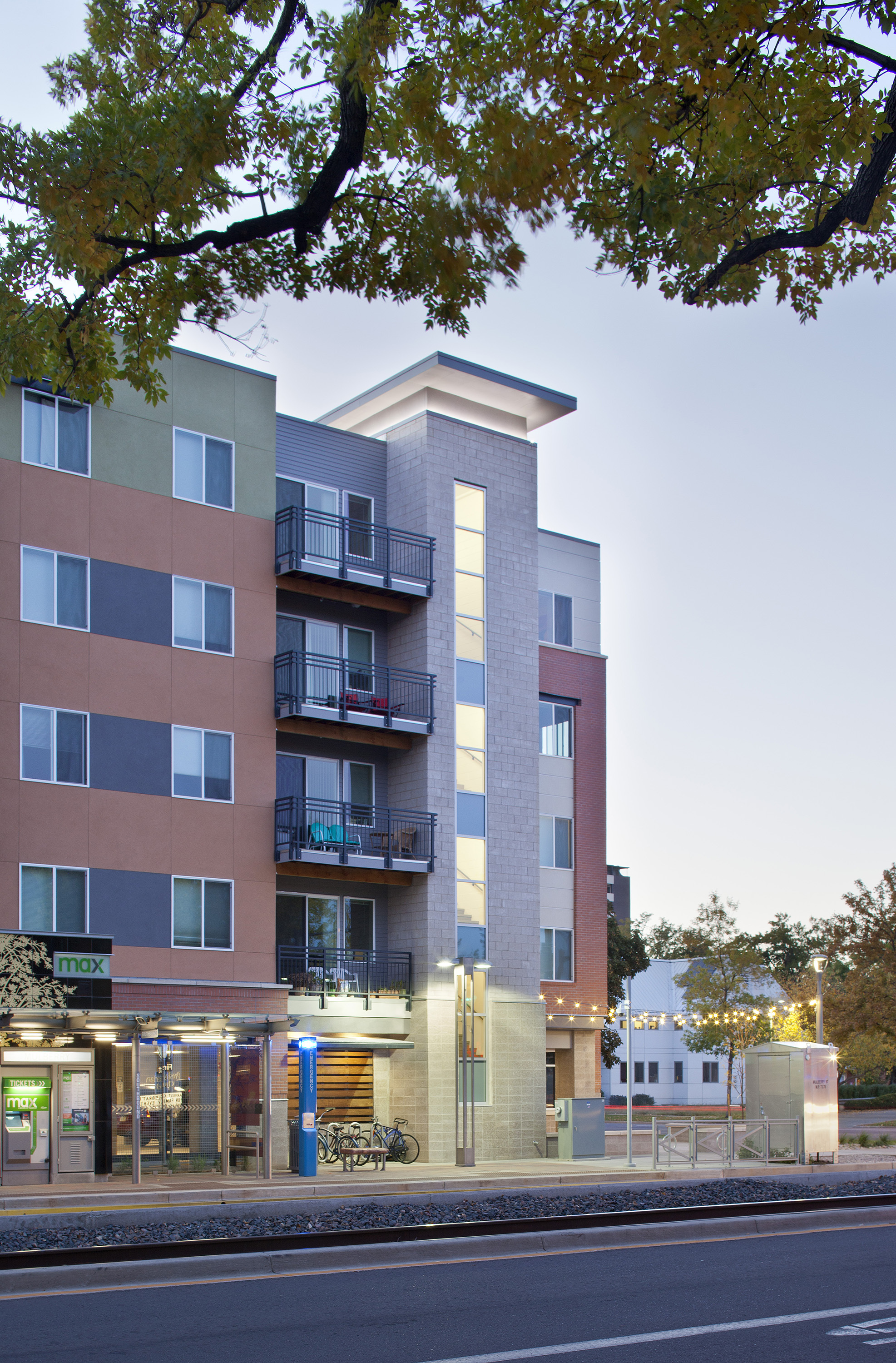 Max Flats set the tone for future development and revitalization of Fort Collins’ Mason Street corridor. The project is strategically situated along the bus rapid transit system and helps foster multi-modal connectivity to campus activities and downtown retail development. As the first project to meet the City’s renewal goals, Max Flats is defined by notable architectural features: a bold color scheme, exposed steel structural canopies, rich brick and stone facades, sustainable green walls, and exterior patios for informal gatherings.