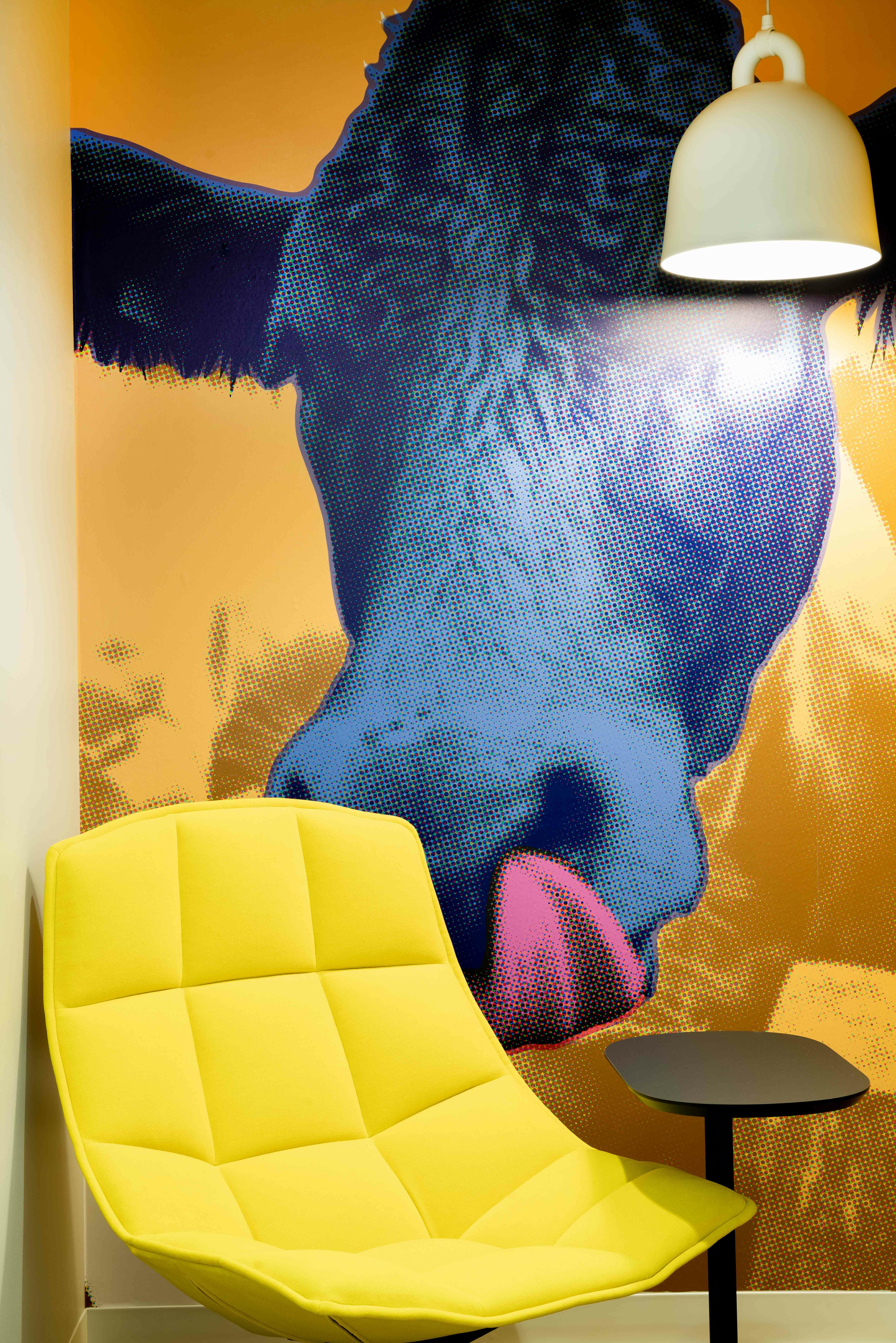 Our design incorporated natural wood materials with a wood/moss sign installation at the entry. Custom graphics are included throughout to introduce color within the neutral palette, as well as a custom cow bell art wall installation.