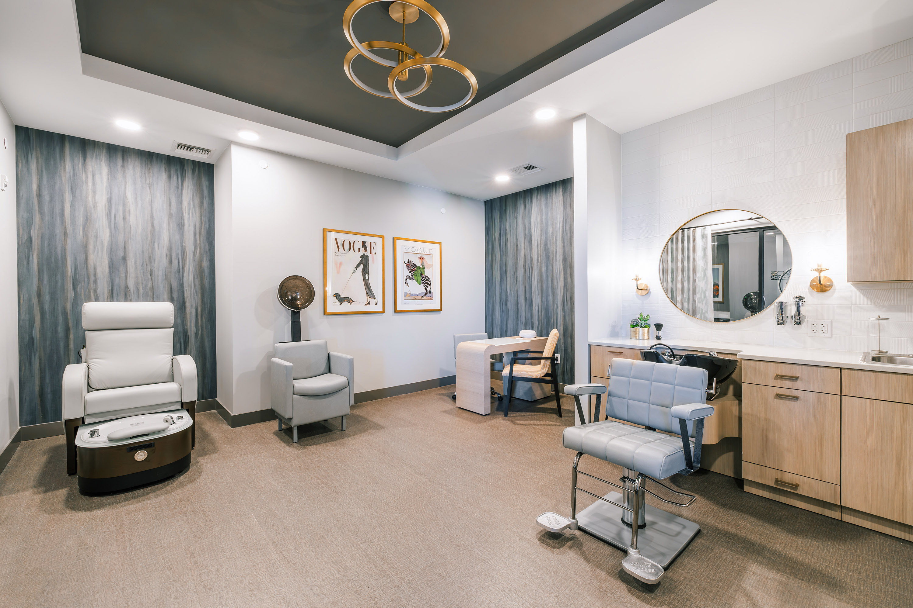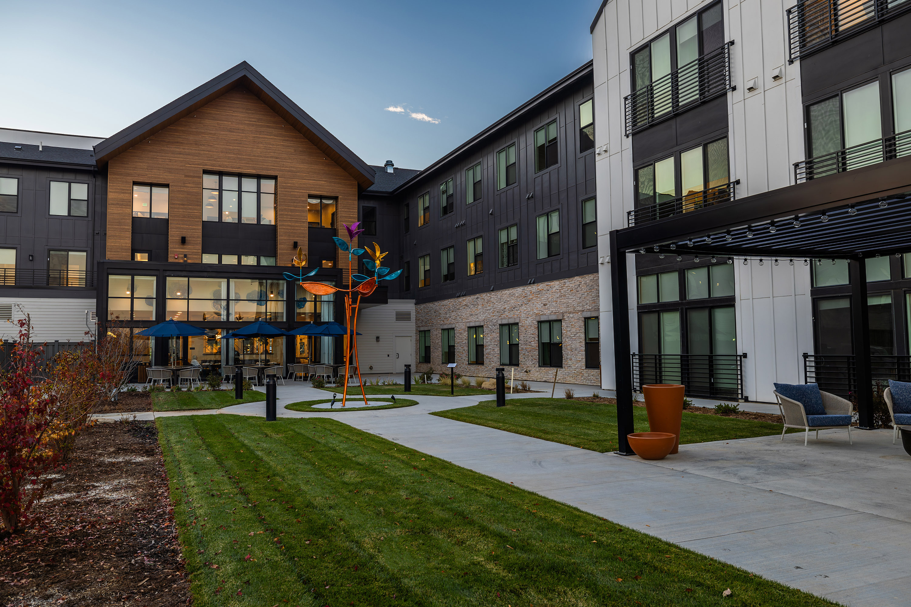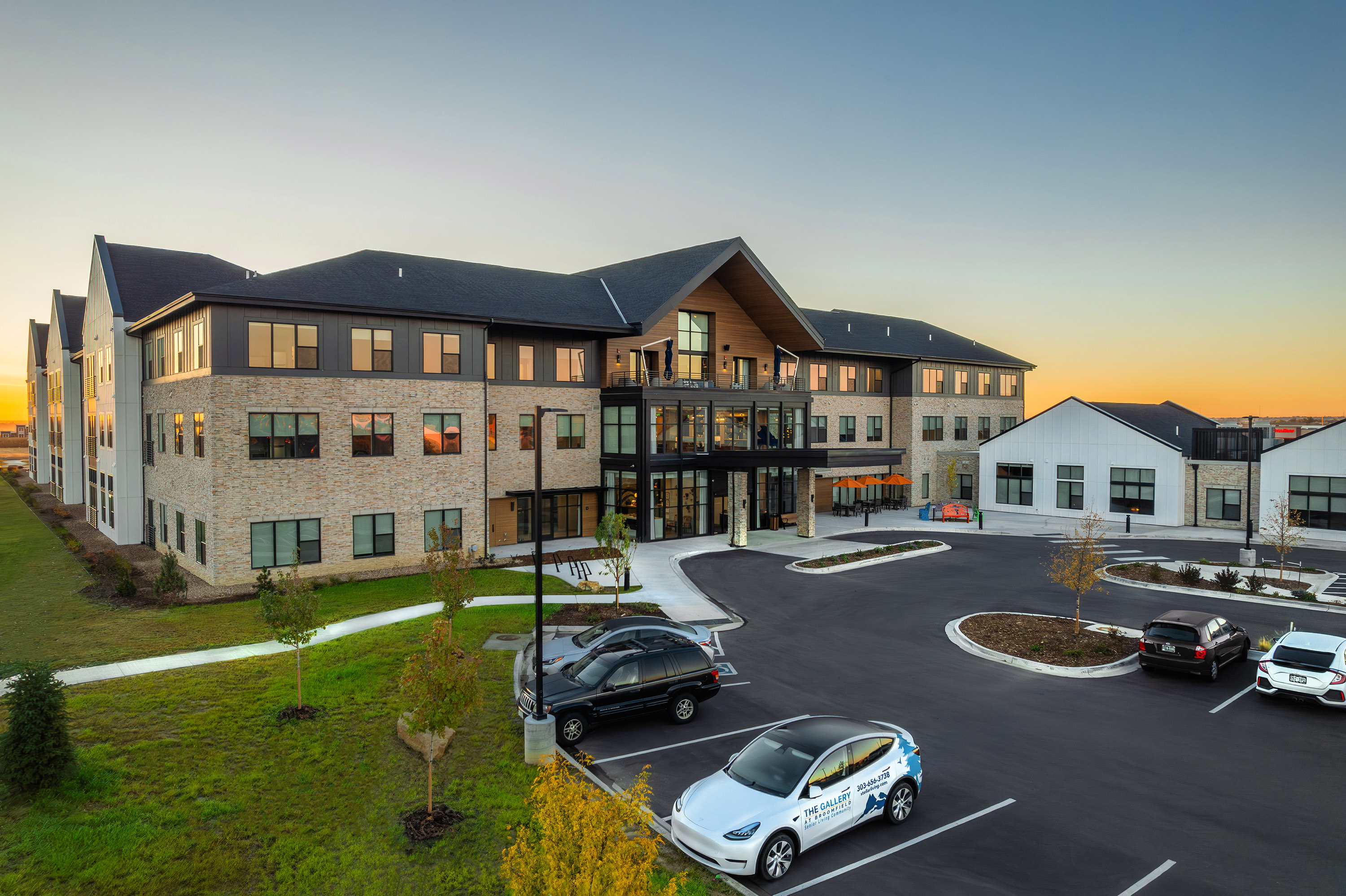 The Gallery at Broomfield stands as a testament to our team's dedication to optimizing the environment and enhancing residents' physical and mental well-being. It was meticulously planned to encourage residents to connect with loved ones, the broader community, and Colorado's scenic beauty. Deliberate measures were taken, such as providing access to sunlight for north-facing single-family homes and establishing a buffer between commercial and residential areas. Onsite walking paths offer diverse outdoor activities, and the southeast plaza can host events like food trucks or farmer’s markets. The building's exterior harmonizes the region's agricultural heritage with modern elements like stone bases and horizontal siding. Internally, a hospitality design approach minimizes walls, promoting activity and socialization in shared spaces; this thoughtful design fosters 'chance socialization' among residents. The assisted living community extends this inclusive approach across three levels, incorporating attached outdoor spaces. Resident suites prioritize natural light and simplicity, with embellished kitchens on the third-floor catering to more independent residents. The design's high ceilings and contemporary finishes create an inviting modern mountain-plains atmosphere.