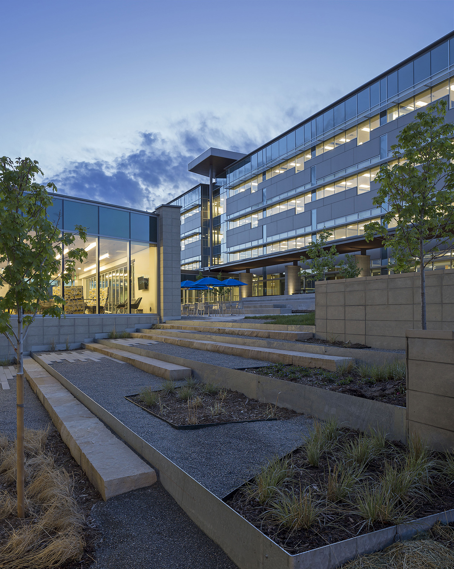 OZ developed and implemented a sustainability design strategy that balanced the goal of creating a more engaging, collaborative space for employees with a reduced environmental footprint. Phase 1 was LEED Gold Certified, and Phase II was LEED Silver Certified. To achieve a feeling of lightness and openness within the workspaces, interior light shelves were installed, which bounce light deep into interior spaces. Exterior sunshades also block direct sunlight in the summer months. The facility’s landscaping is irrigated through the City of Westminster’s purple pipe non-potable water system, and the onsite vegetated swales, filter strips, and water quality pond treat 90% of stormwater to remove pollutants before the water returns to the environment. A 600-sf parking island was planted with pear trees, raspberries, strawberries, and other edible landscaping to demonstrate feasibility of office agriculture. Overall, the Trimble office buildings achieve approximately 30% energy cost savings over the ASHRAE 90.1 2007 baseline.