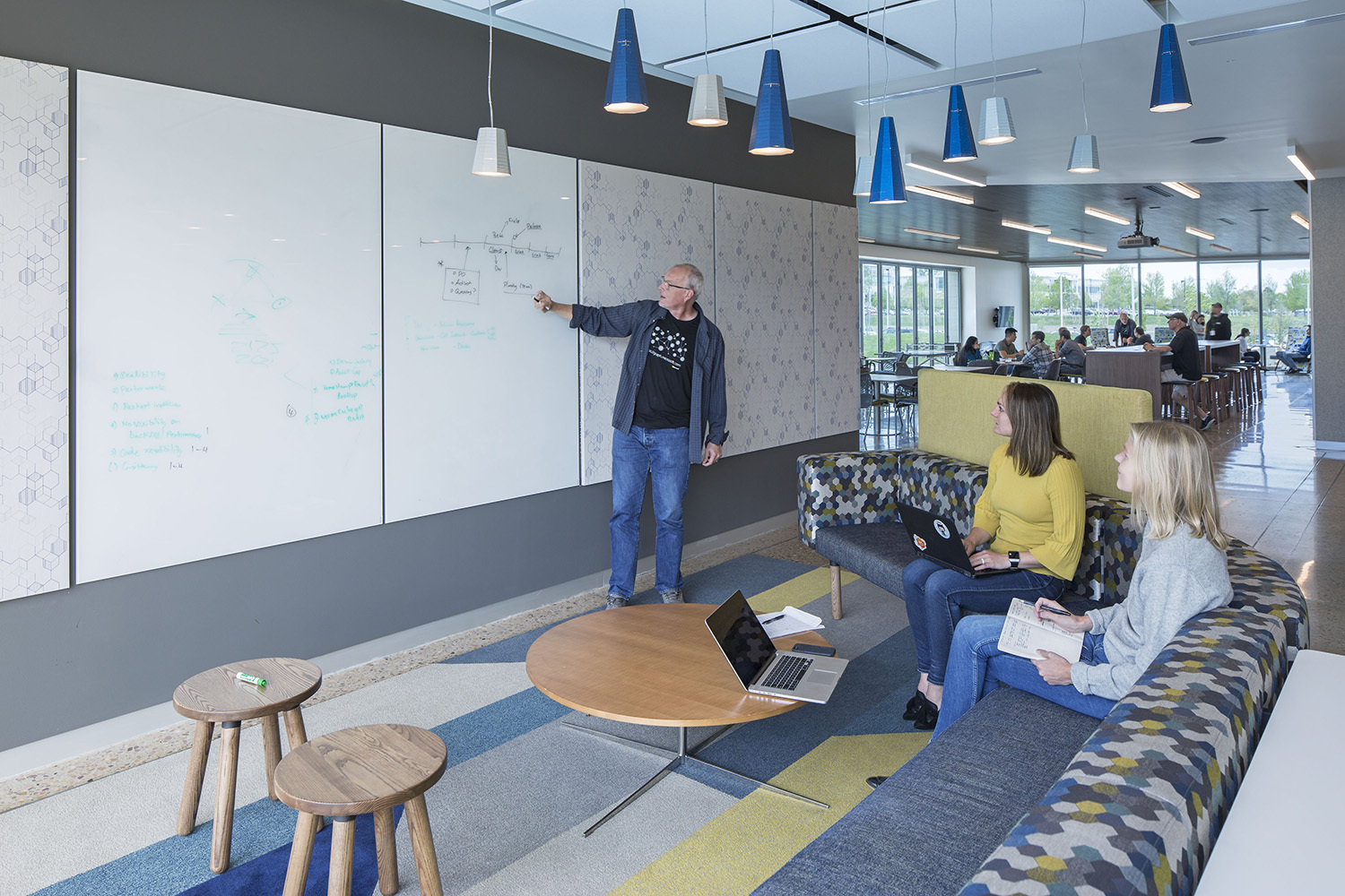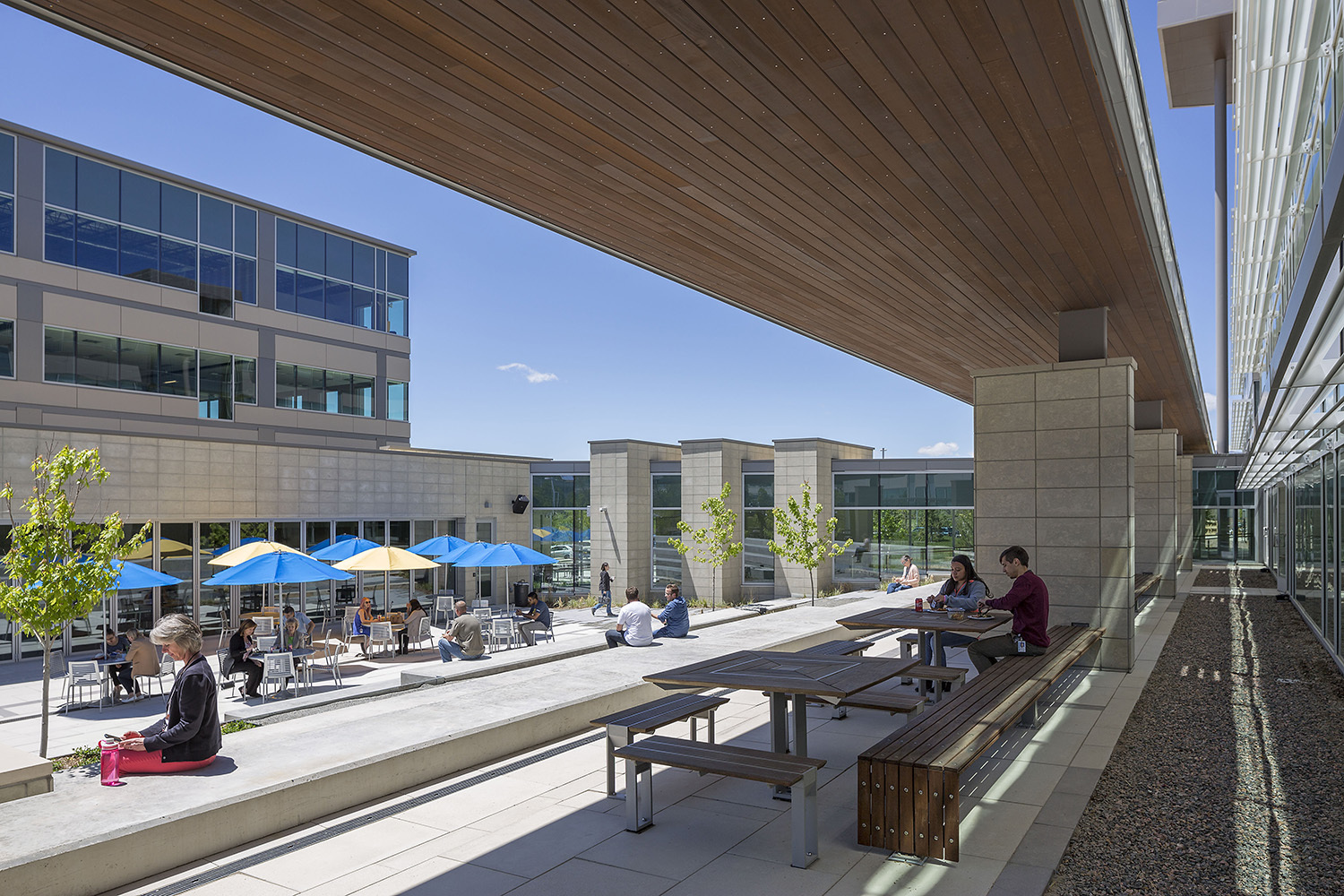 During Phase II design, the connectivity that was so successful in Phase I became a key driver. It was critical to allow employees to stay engaged with other teams across buildings. The Pavilion space connected an enclosed breezeway between the two buildings, creating a social hub that is the gathering spot between the buildings. An operable glass wall opens to a new outdoor amphitheater.